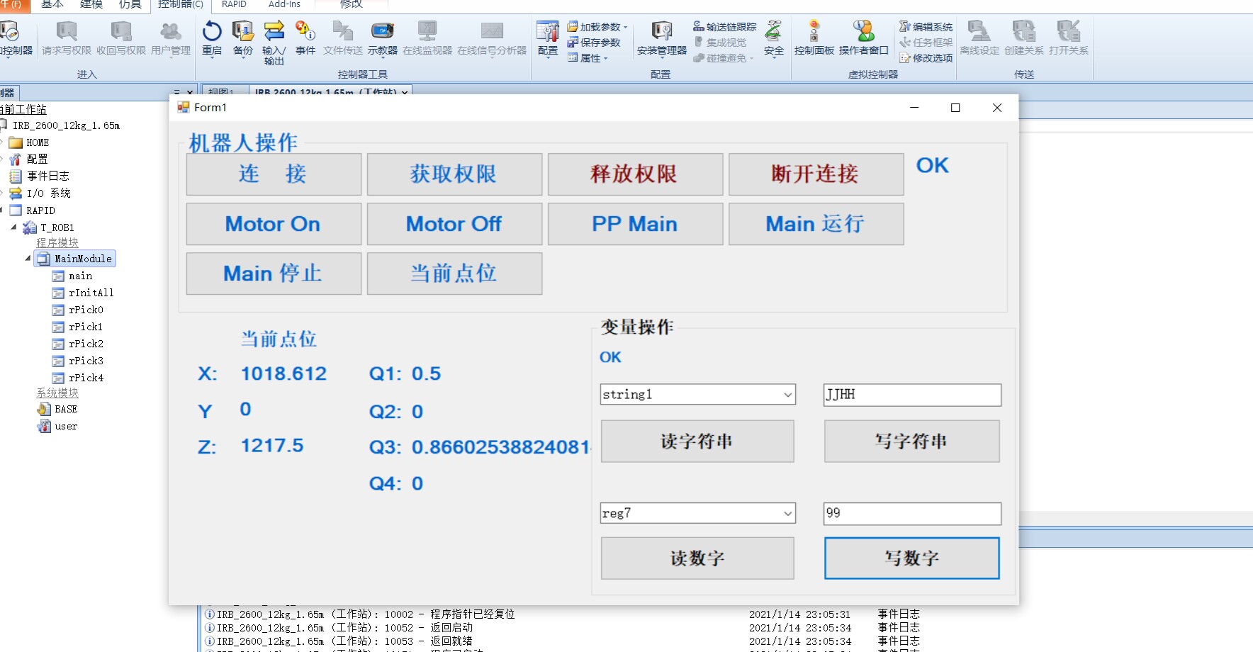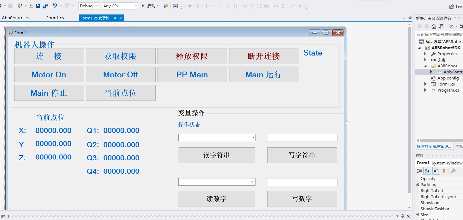 ABB机器人二次开发 C#读取和写入数据,可以获取点位信息及写入点位信息。 自己写的ABB机器人类,机器人常规操作功能都有,非常适合进行二次开发。